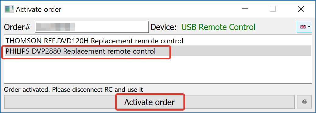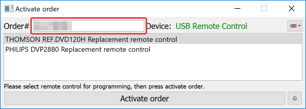 If you ordered several RCs, please select the needed RC for programming, then press the "Activate Order" button at the bottom of the window.
